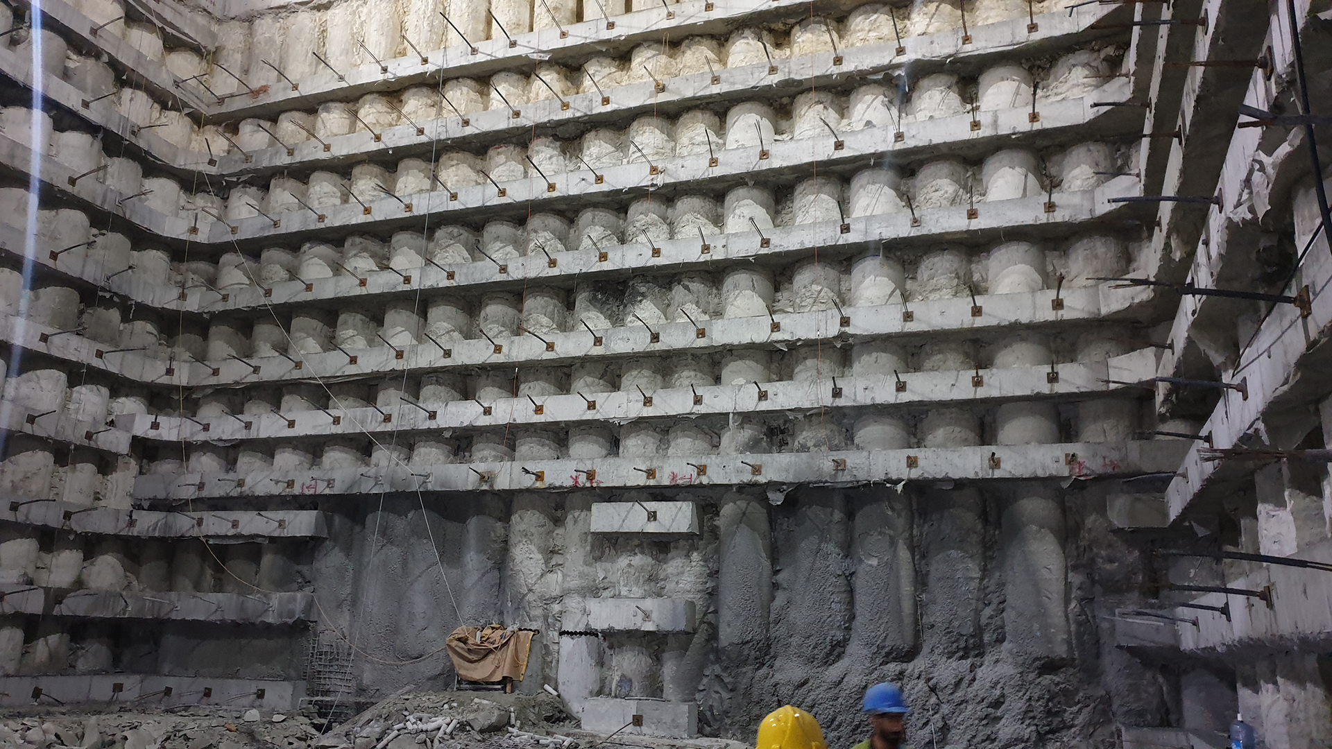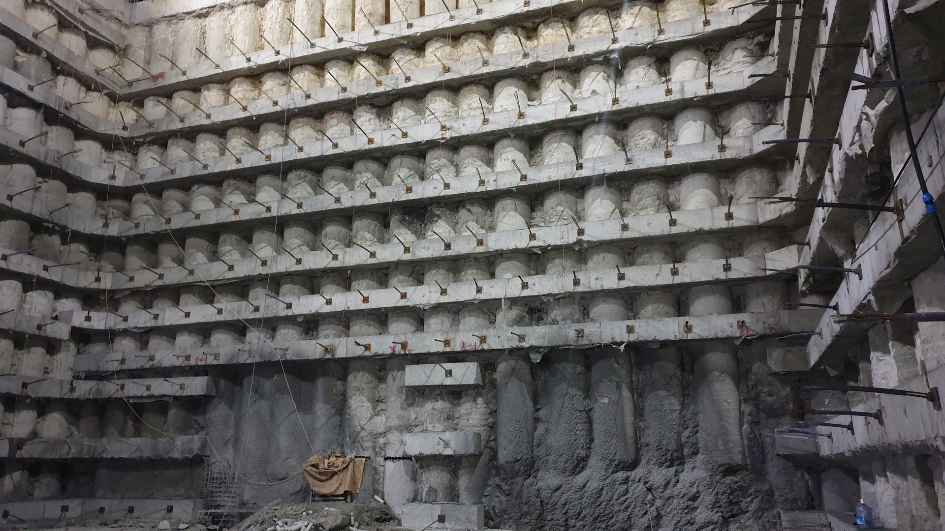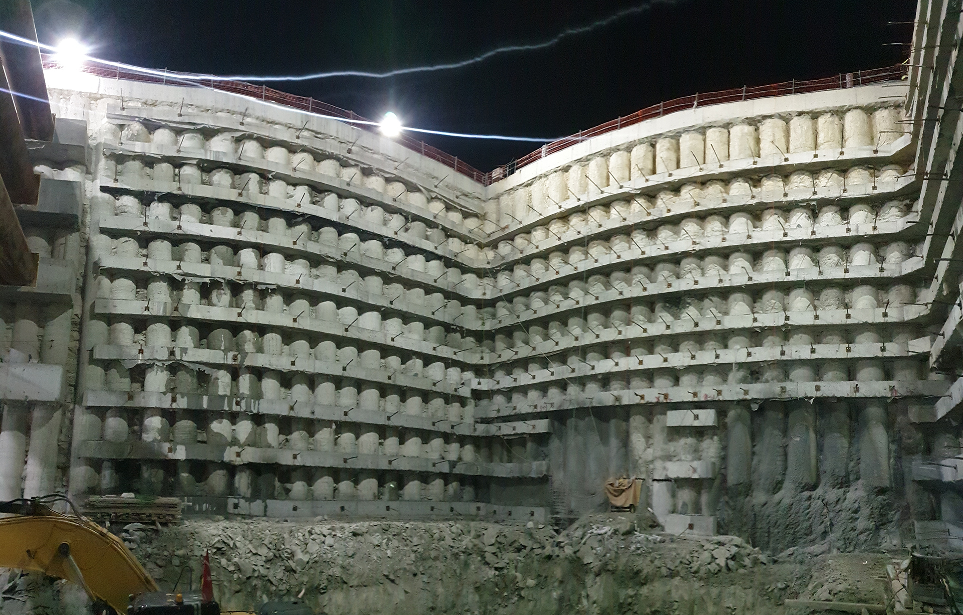 TBM Giriş istasyonunda yapılan 30 m deriniliğindeki kazık destek işlerinin yapımı. Fore kazık, ankraj, püskürtme beton ve strut imalatlarının yapılması